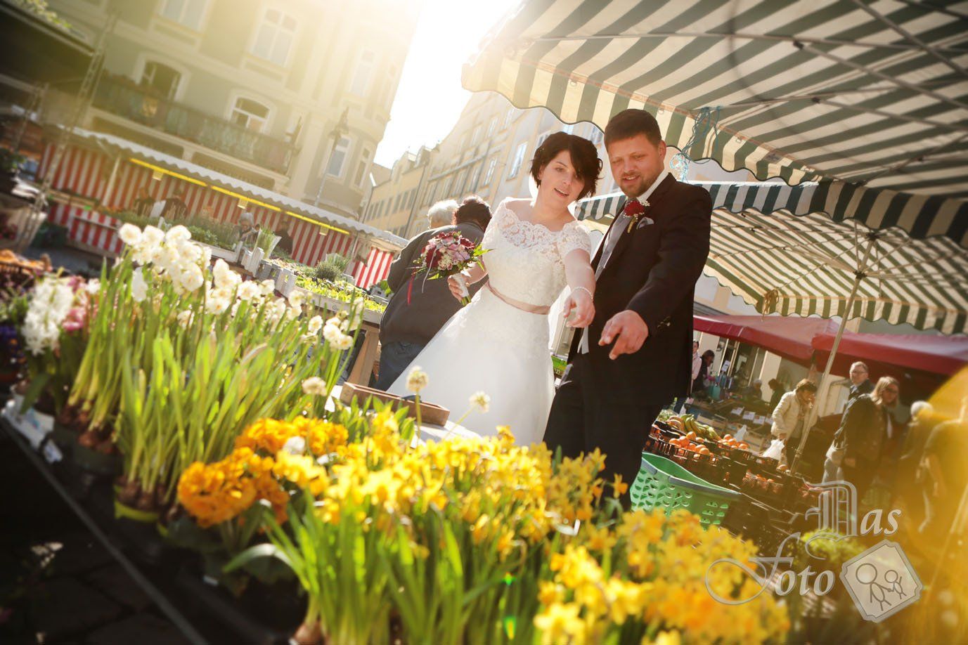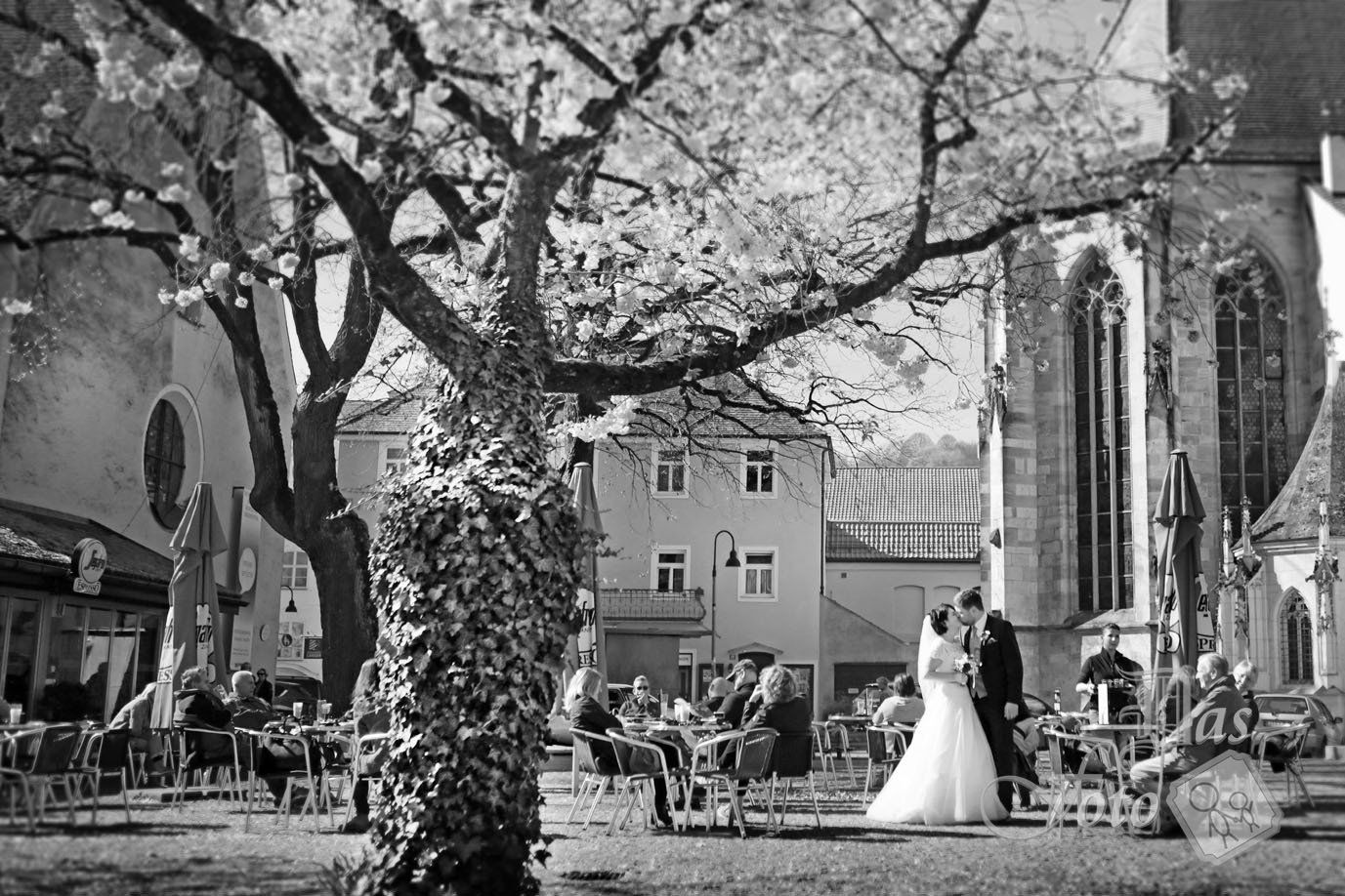 Zwei richtig coole Socken sind die Barbara und der Richard, gepost haben die beiden, als hätten sie nie etwas anderes gemacht, und für jeden Schmarrn waren sie zum ham: Jumping im Brautkleid, Kaffeetrinken in der Menschenmenge, Knutschen zwischen Touristengruppen und Shopping auf dem Eichstätter Markt - alles in voller Hochzeitsmontur versteht sich. Und damit das Abenteuer heiraten noch einen kleinen Kitzel bekommt, durften die beiden nach der Trauung vorne in der Schaufel eines Bulldogs mitfahren. Hab mich sehr amüsiert mit euch zwei Hübschen!!